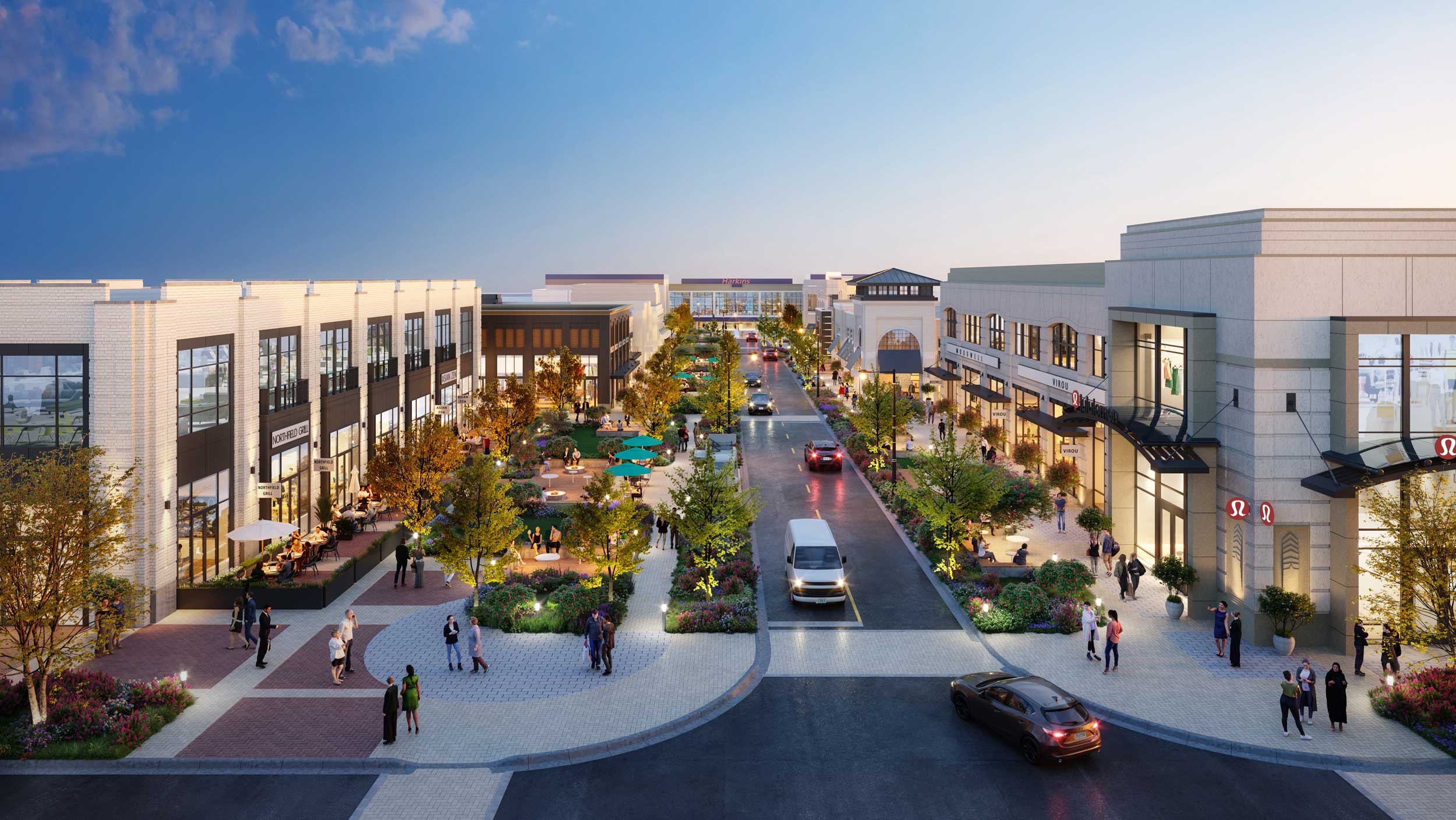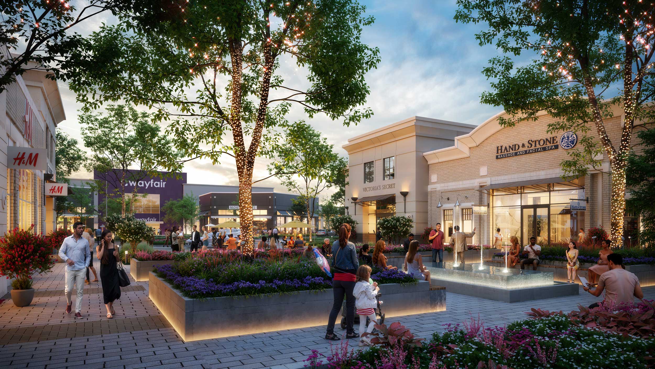 • A public green space on Main Street, with vibrant landscaping and kids’ play amenities, and a new drop-off and arrival experience.